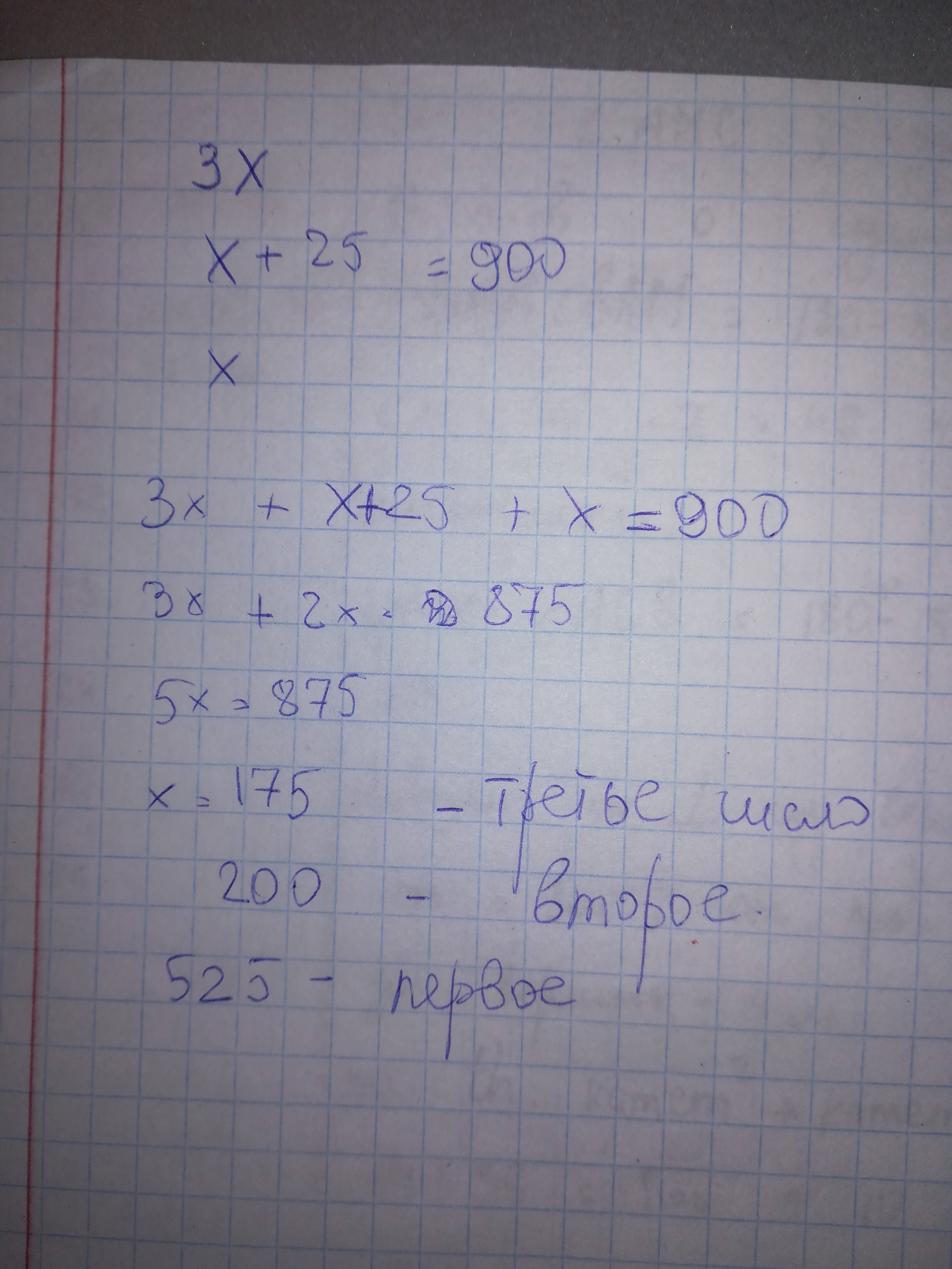 Сумма трёх натуральных чисел равна 900 .Найдите эти числа если второе число в три раза больше чем первое и на 25 меньше чем третье число