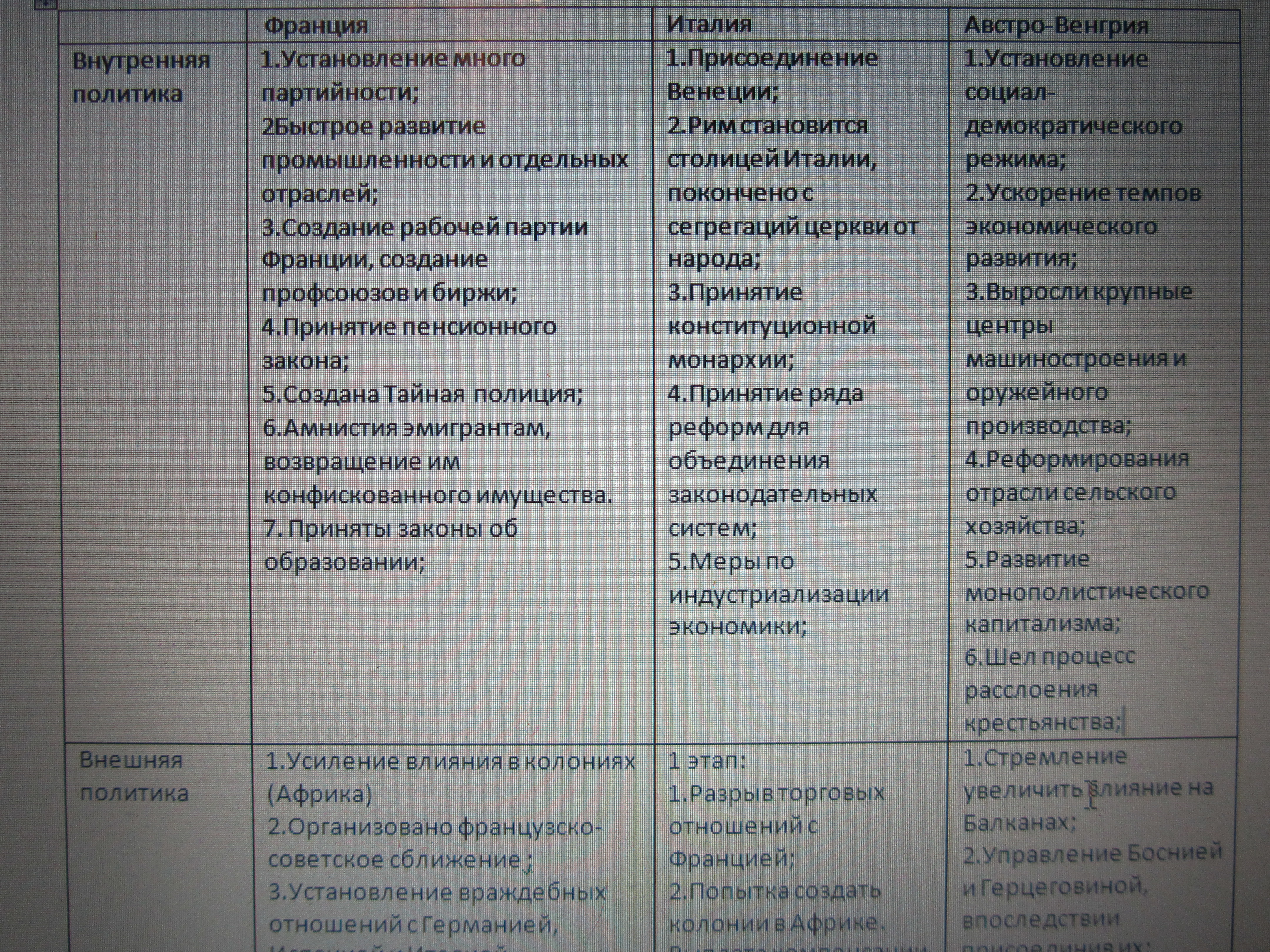 Таблица внешняя и внутренняя политика Франция Италия австра-венгрия Европа в конце 19 в начале 20 века история 8 класс пожалуйста