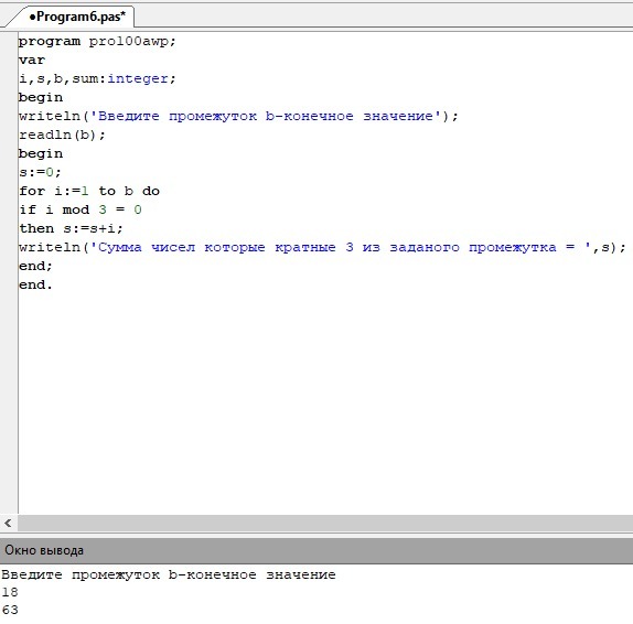 Составить программу для нахождения суммы чисел кратных трем в интервале от 1 до b ПОМОГИТЕ ПОЖАЛУЙСТА