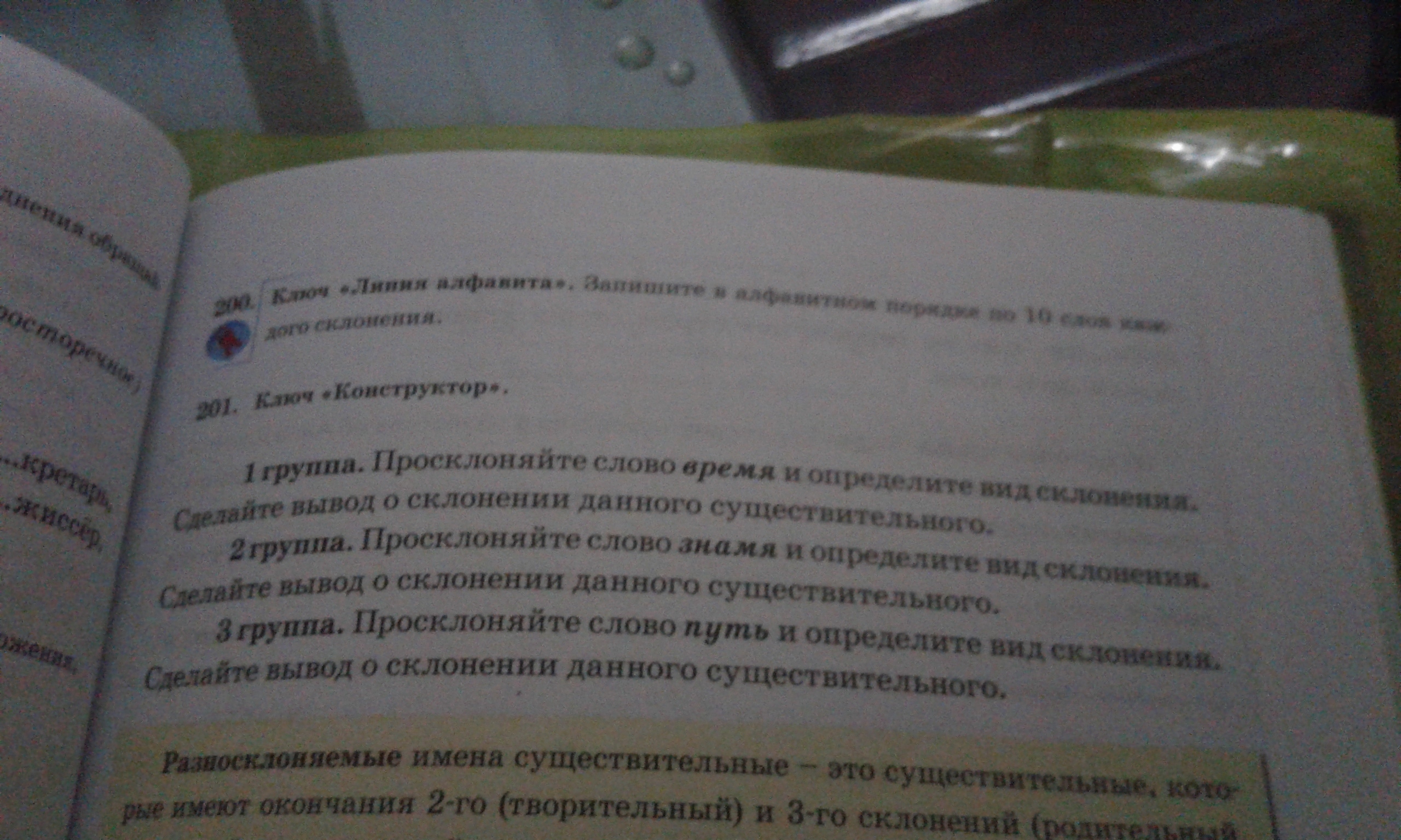 номер 200.Ключ "Линия алфавита".Запишите в алфавитном порядке 10 слов каждого склонения