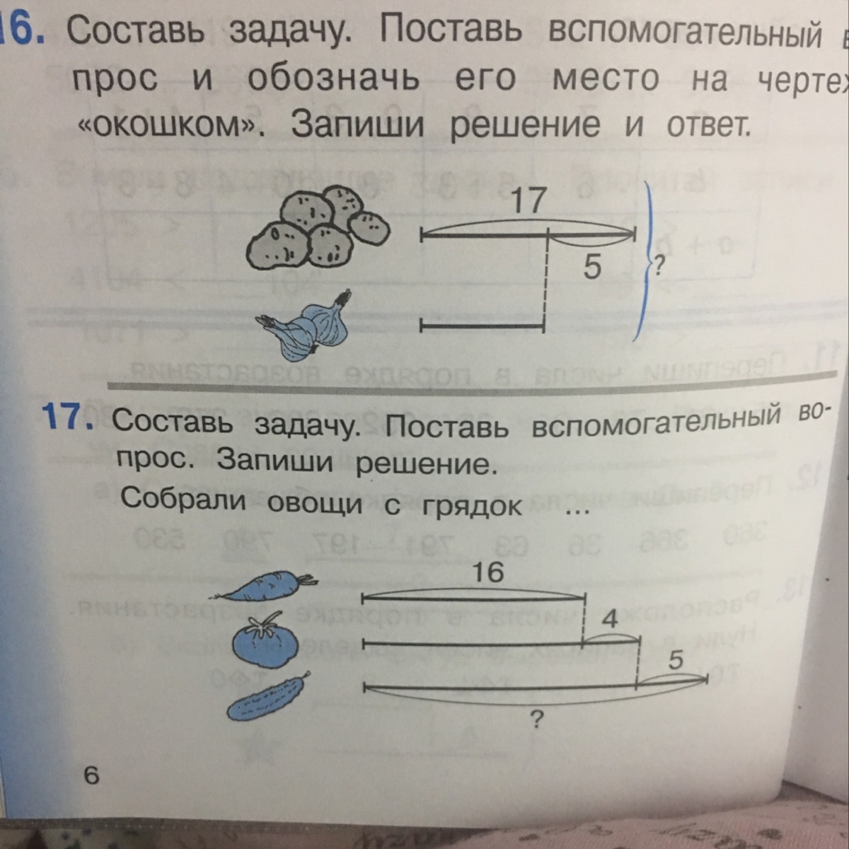 Составь задачу .Поставь вспомогательный вопрос и обозначь его место на чертеже окошком .запиши решение и ответ?16 и 17 номер