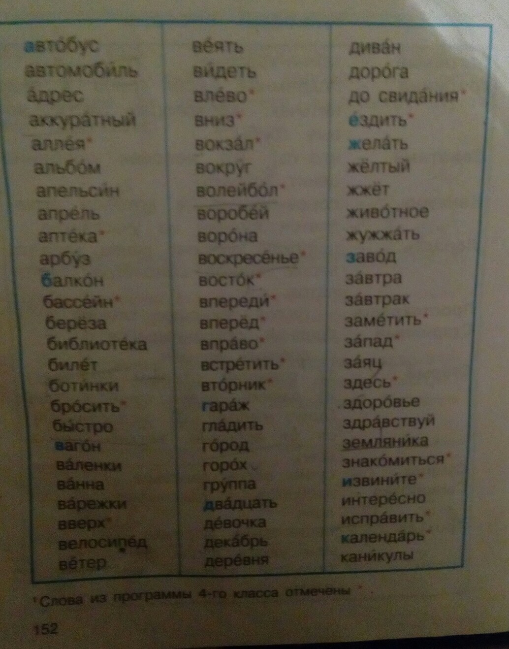 Автобус,веять,ворона,здоровье,земляника, интересно,календарь, волейбол,воробей,воскресенье,девочка,ботинки,велосипед,береза, библиотека.