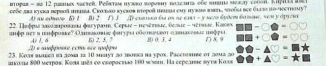 Пожалуйста помогите. Цифры закодированы фигурами,серые -нечетные, белые -четные. Каких цифр нет в шифровке? Одинаковые фигуры обозначают одинаковые цифры. Задача 22.