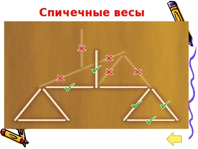 из 9 счетных палочек выложи модель аптекарских весов, которые не находятся в равновесии. Переложи 5 палочек так, чтобы весы пришли в равновесие