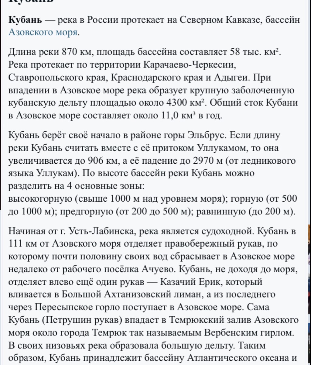 Длина 870 км, площадь бассейна 58 тыс. км². Протекает по территории Карачаево-Черкесии, Ставропольского края, Краснодарского края (662 км) и Адыгеи. При впадении в Азовское море река образует крупную заболоченную, но высокопродуктивную кубанскую дельту площадью около 4300 км². Общий сток Кубани в Азовское море составляет около 11,0 км³ в год.