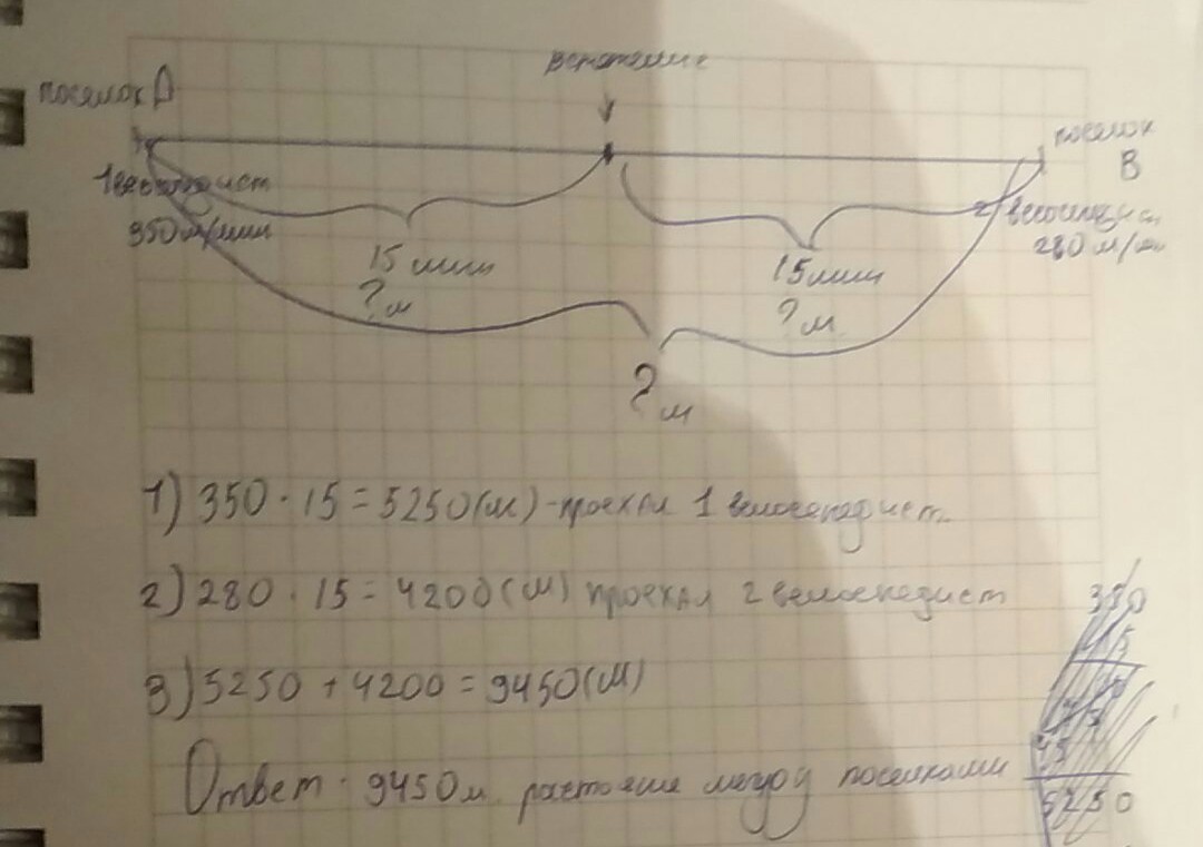 Из двух посёлков навстречу друг другу выехали два велосипедиста.Один ехал со скоростью 350 м/мин,а другой - со скоростью 280 м/мин.Через 15мин они встретились.Найди расстояние между посёлками.