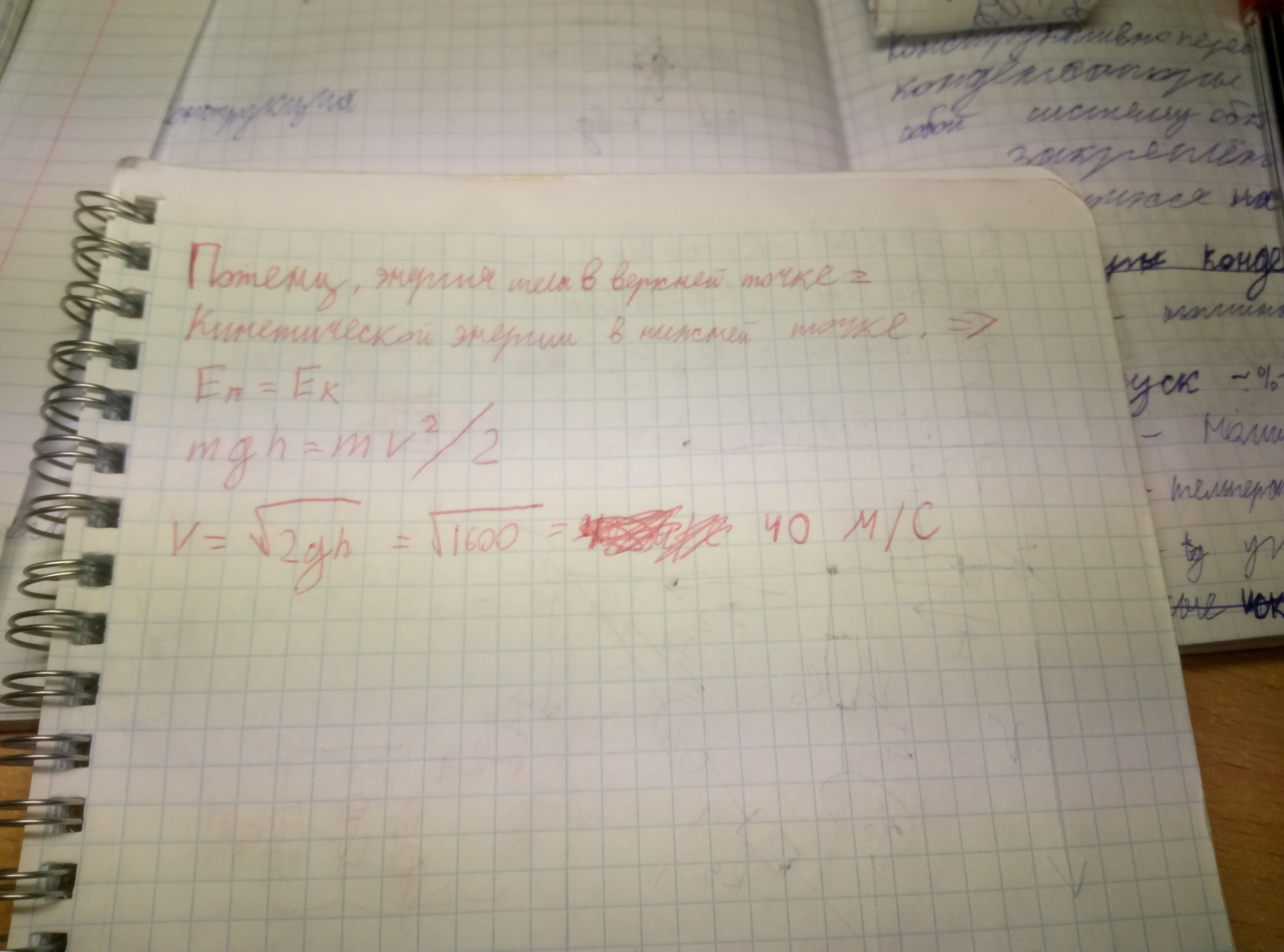 ответ на первый вопрос. кривым почерком написано: потенциальная энергия тела в верхней точке = кинетическо энергии в нижней точке. следовательно