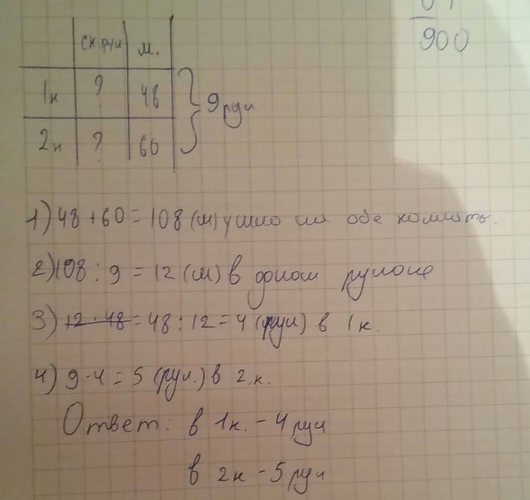 На оклейку двух комнат пошло 9 рулонов обоев одинаковой длины.На одну комнату пошло 48 м обоев,на другую-60 м. Сколько рулонов обоев пошло на каждую комнату?