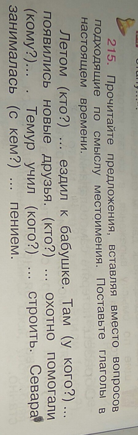 Летом я поехал к бабушке. Там у меня появились новые друзья. Они охотно помогли мне. Темур научил меня строить. Севара занялась со мной пением.