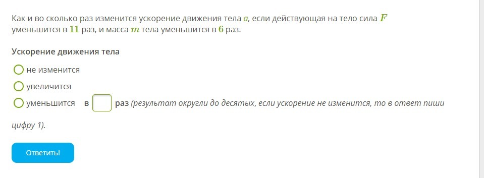 Как и во сколько раз изменится ускорение движения тела а, если действующая на тело сила F уменьшится в 11 раз, и масса m тела уменьшится в 6 раз.