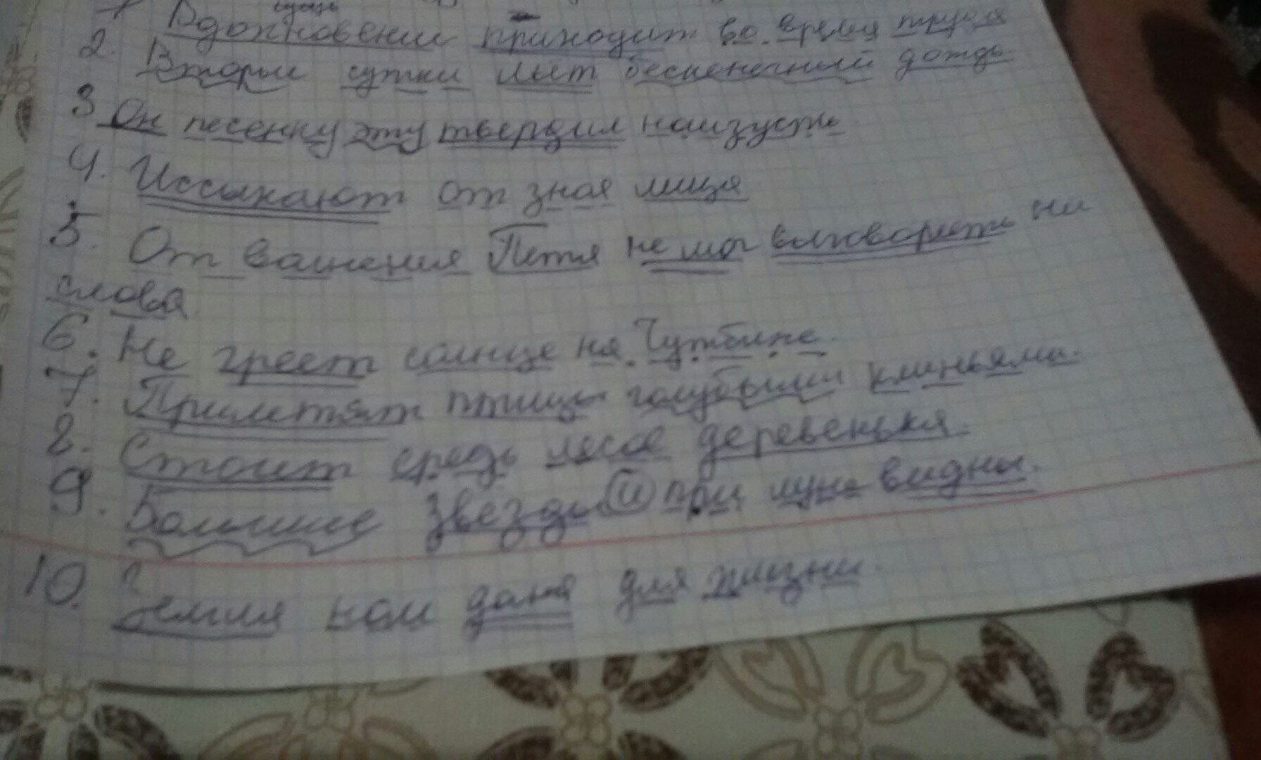 1. Вдохновение приходит во время труда. 2. Вторые сутки льёт бесконечный дождь. 3. Он песенку эту твердил наизусть. 4. Иссыхают от зноя лица. 5. От волнения Петя не мог выговорить ни слова. 6. Не греет солнце на чужбине. 7. Прилетят птицы голубыми клиньями. 8. Стоит средь лесов деревенька. 9. Большие звёзды и при луне видны. 10. Земля нам дана для жизни.