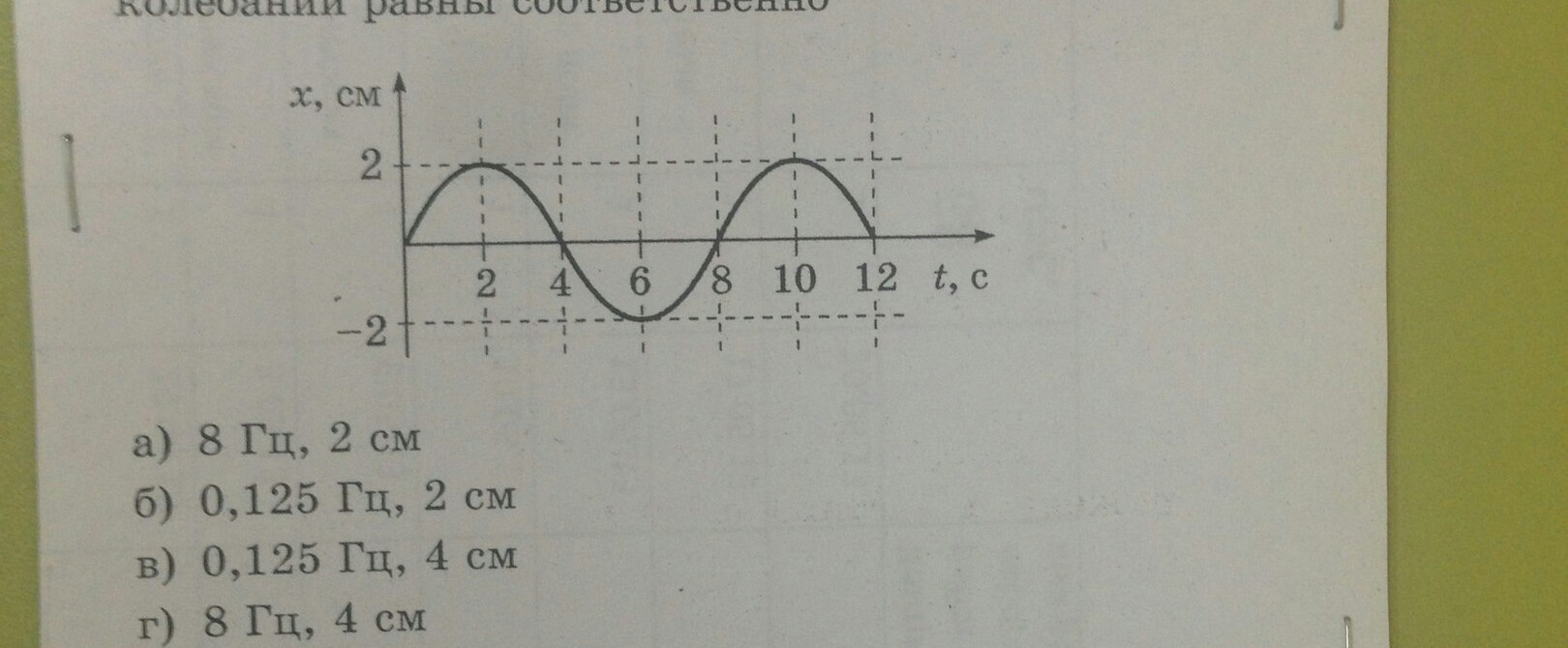 Амплитуда 2 см; частота=N/t=1/8c=0,125Гц. Ответ: Б)