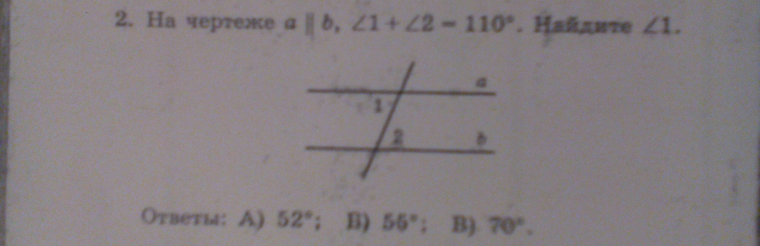 угол 1 равен углу 2, так как они накрест лежащие, если угол 1 + угл 2 =110 градусов , тогда, что бы найти угол 1 нужно 110 разделить на 2=55 градусов
