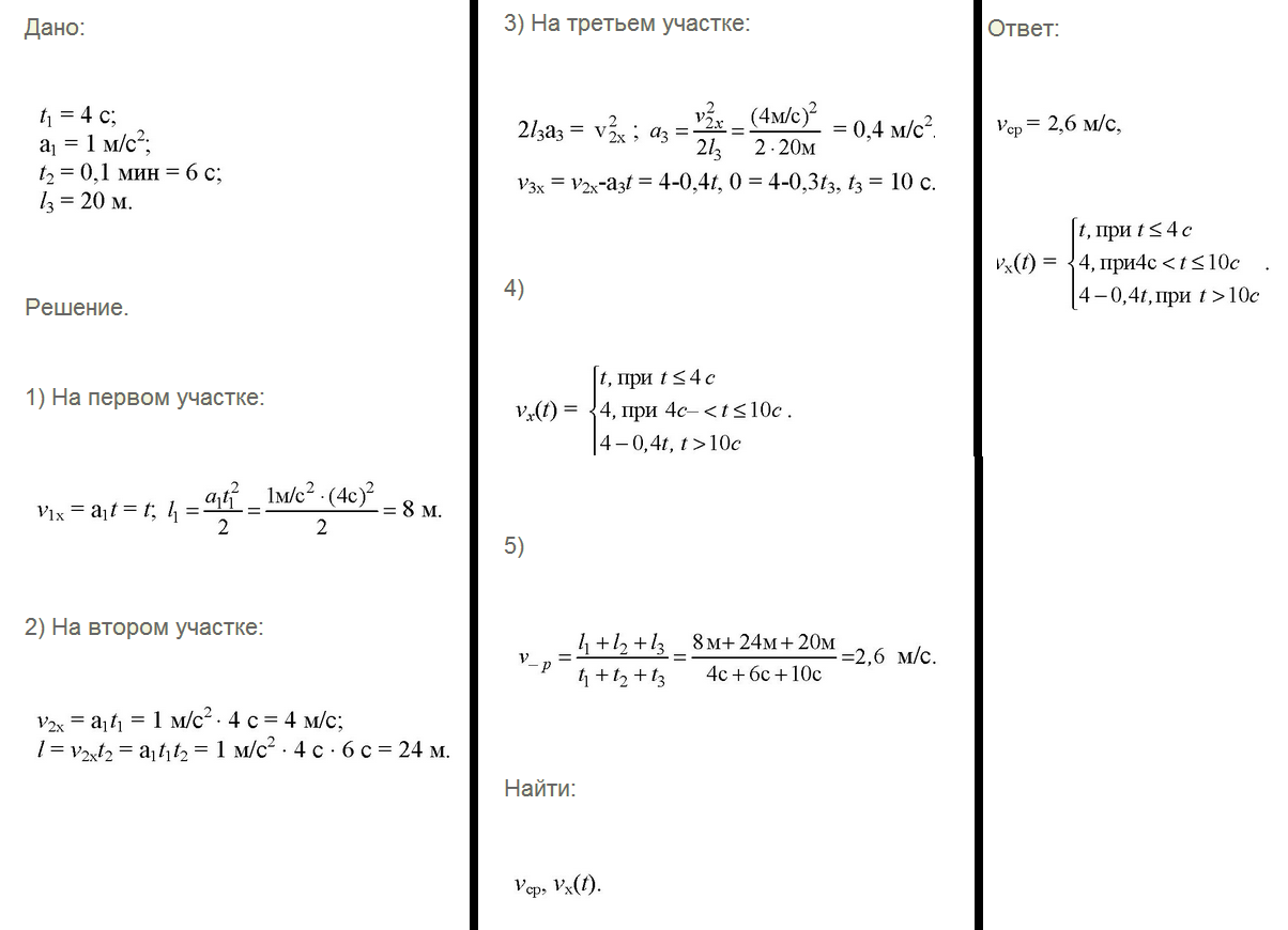Велосипедист начал свое движение из состояния покоя и в течение первых 4 с двигался с ускорением 1 м/с2; затем в течение 0,1 мин он двигался равномерно и последние 20 м — равнозамедленно до остановки. Найти среднюю скорость за все время движения.