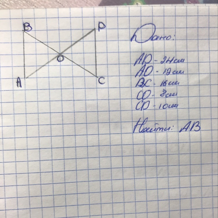 Треугольник ABO и треугольник DCO равны по двум сторонам(ВО=ОС; АО=ОD) и углу(угол ВОА=углу СОD(вертикальные)) между ними. Следовательно, АВ=CD=10см