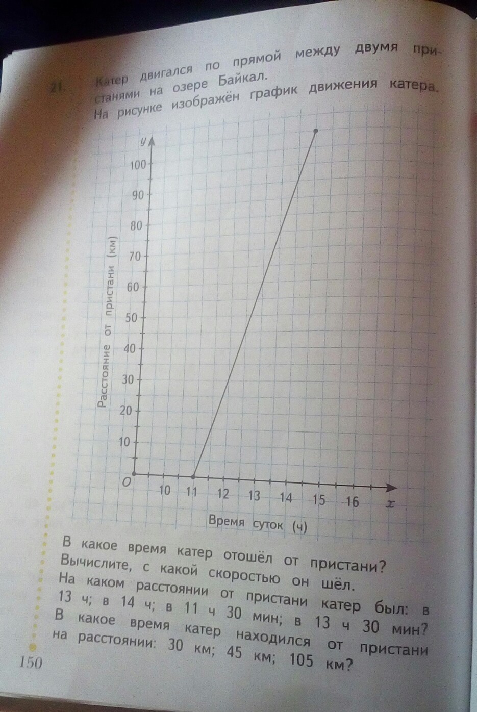 Катер вышел с пристаги в 11 ч. Проплыл всего 105 км по графику. Время всего движения заняло (14,5-11)=3,5 часа. Скорость катера=105/3,5=30 км/ч.