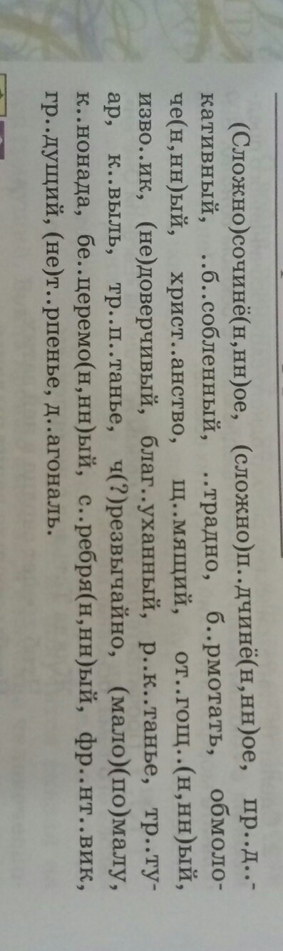 сложносочиненное ,сложноподчиненное ,предикативный,предикативный, отрадно,бормотать ,обмолоченный ,христианство ,щемящий ,отягощенный ,извозчик , недоверчивый ,благоуханный ,рокотанье, тротуар ,ковыль ,трепетанье,черезвычайно , мало по малу, канонада , бесцеремонный , серебряный ,фронтовик , грядущий ,нетерпение ,диагональ