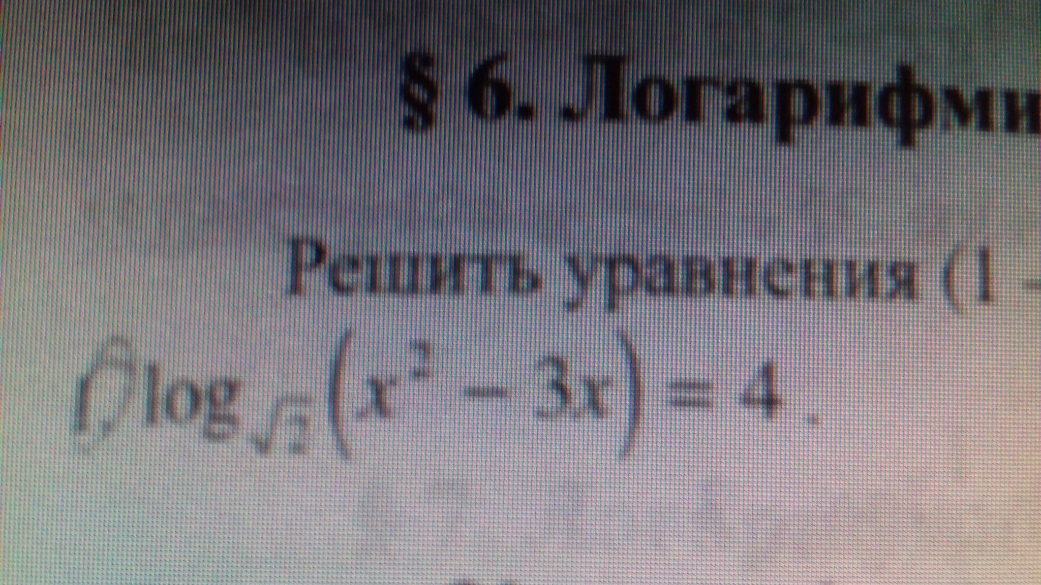 этот логарифм означает что корень из 2 в 4 встепени равен (x^2-3x),т.е. x^2-3x-4=0 и решаешь это квадратное уравнение просто,дорешаем: