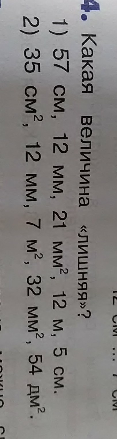 Какая величина лишняя 57 см 12 мм 21 мм квадратный 12 мм 5 см 35 см квадратных 12 мм 7 м квадратных 32 мм квадратных 54 дм квадратных