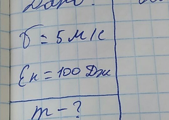 Е(к)=(mv^2)/2=>m=2E(k)/v^2=2×100Дж/25м/с=8кг