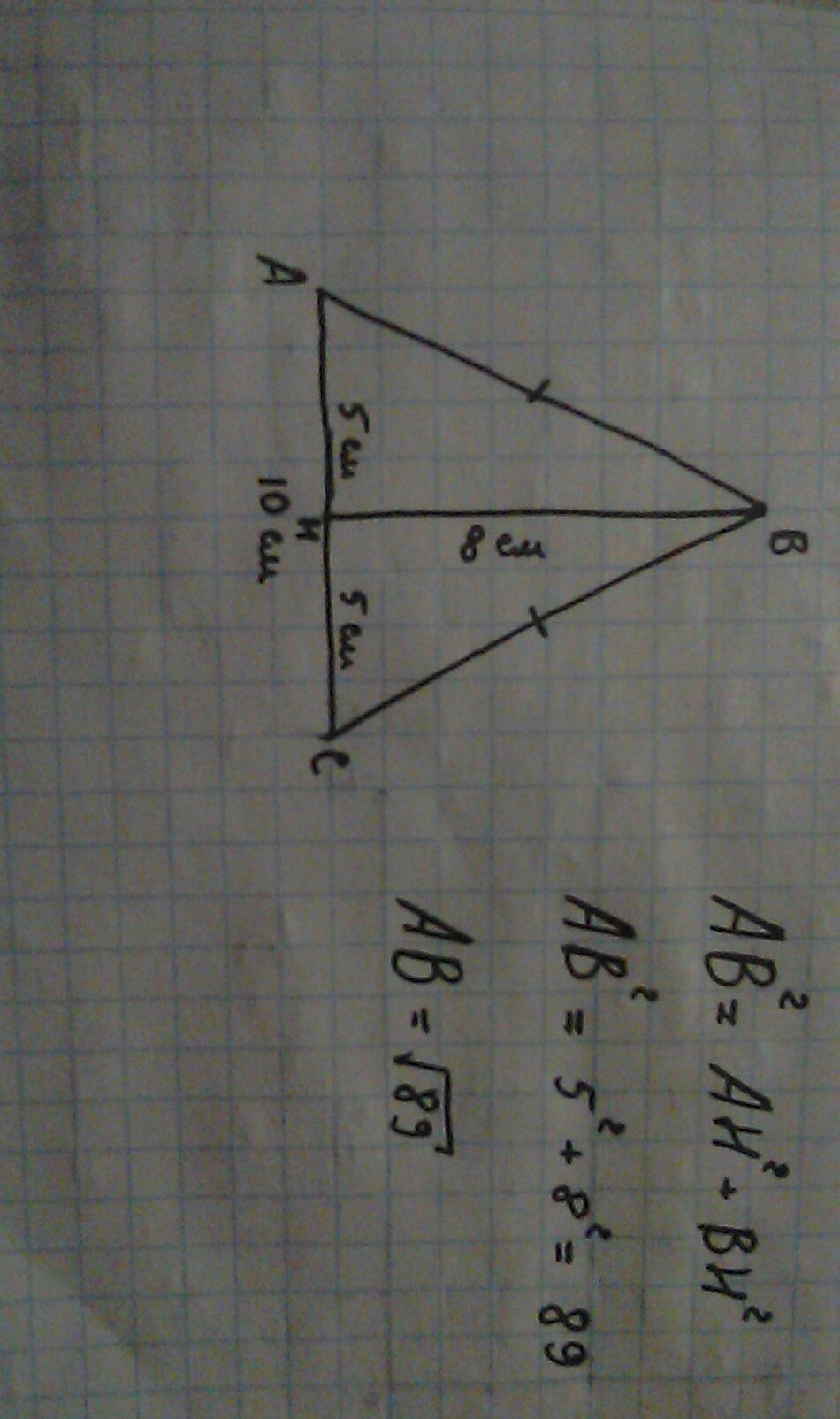 Основание равнобедренного треугольника равно 10 см,а высота,проведённая к основанию,- 8см.Найдите боковую сторону треугольника. ПОМОГИТЕ ПЛЗ ДАНО И РЕШЕНИЕ плз (Теорема Пифагора)