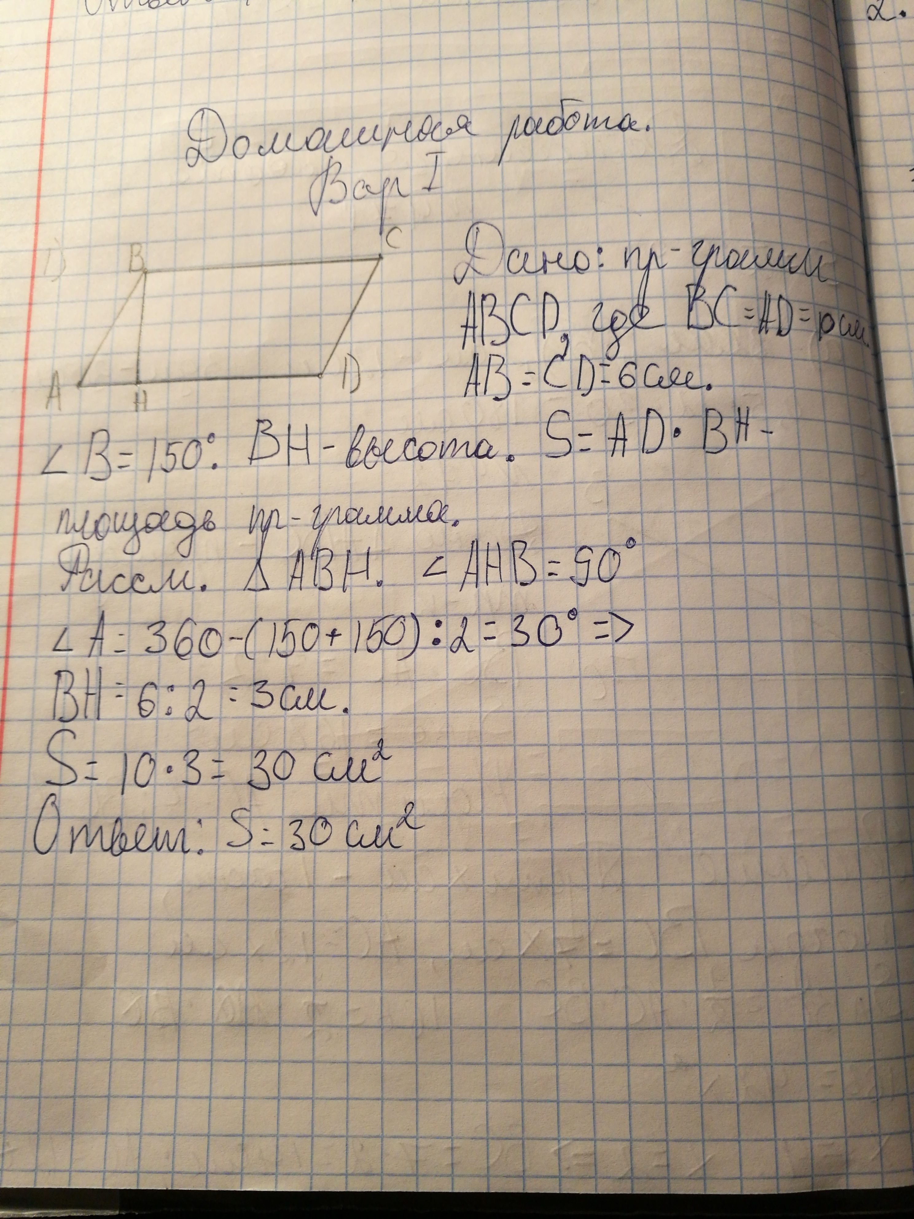 1) угол острый параллелограмма равен (360-150):2=30 градусов