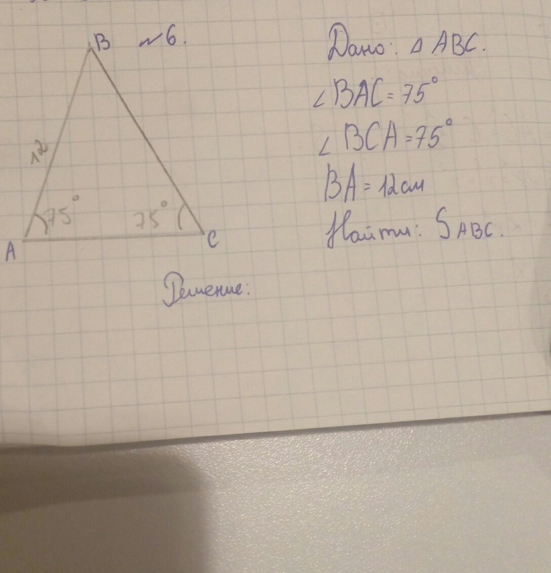 Треугольник равнобедренный, так как углы при основании равны. Значит сторона ВС = АВ = 12, а угол АВС = 30 (180 - (75+75)).