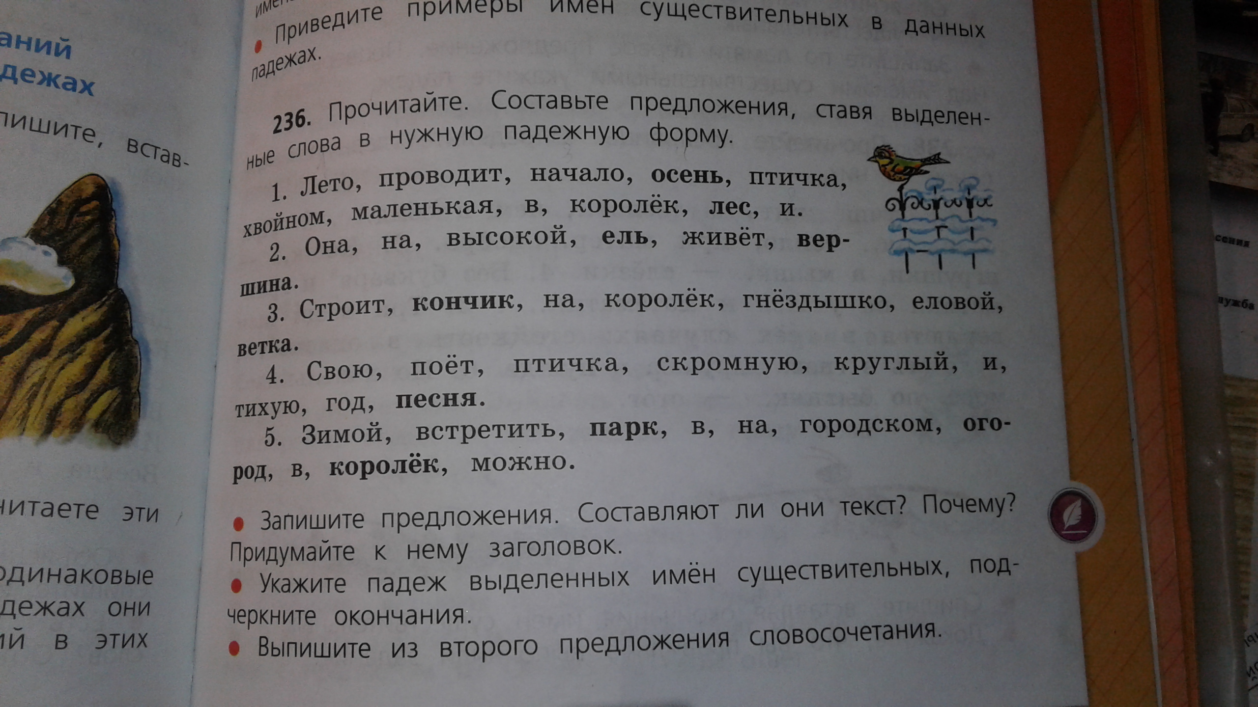 2. Она живёт на вершине(предложный) окончание (е) высокой ели (родительный.)окончание (и). 3. Королек строит гнездышко на кончике(предложенный)окончание (е) еловой ветки(родительный) окончание (и). 4. Круглый год птичка поёт скромную и тихую песню(именительный) окончание (ю).