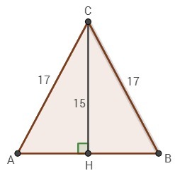 Боковая сторона равнобедренного треугольника равна 17 см , а высота треугольника , проведенная к его основанию 15 см . Вычислите площадь данного треугольника . ПОМОГИТЕ ПОЖАЛУЙСТА С РИСУНКОМ !!!!!!