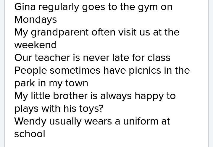 1 Gina _ to the gym on Mondays. ( go/regularly)