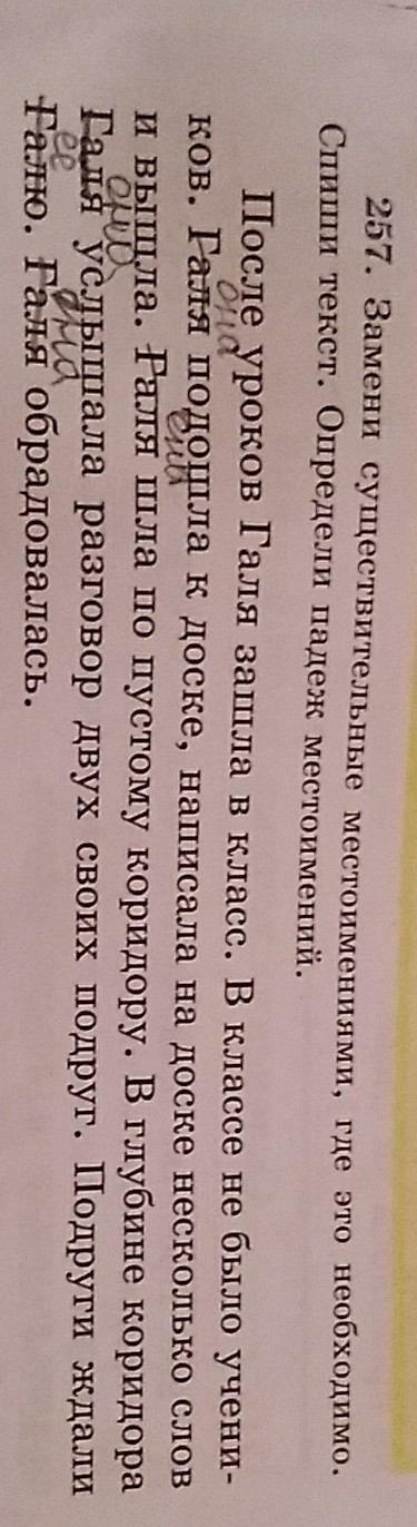 После уроков Галя зашла в класс. В классе не было учеников. Она подошла к доске, написала на доске несколько слов и вышла. Она шла по пустому коридору. В глубине коридора Галя услышала разговор двух своих подруг. Они ждали её. Галя обрадовалась.