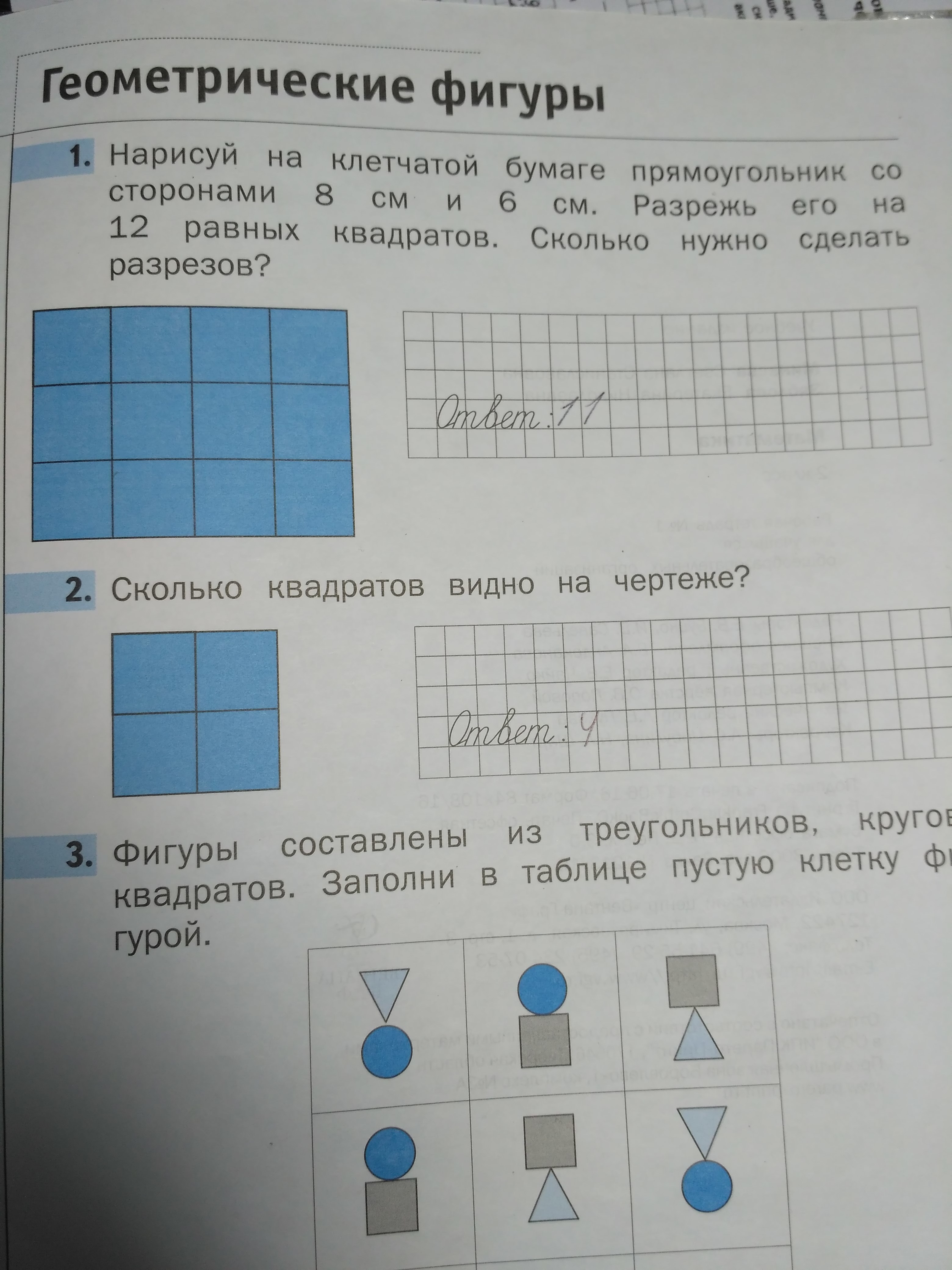 нарисуй на клетчатой бумаге поямоугольник со сторонами 8 см и 6 см разрежь его на 12 равных квадратов. сколько нужно сделать разрезов