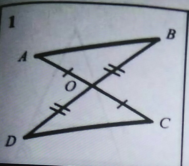 AO=CO, BO=DO, углы AOB и COD равны (по свойству вертикальных углов).