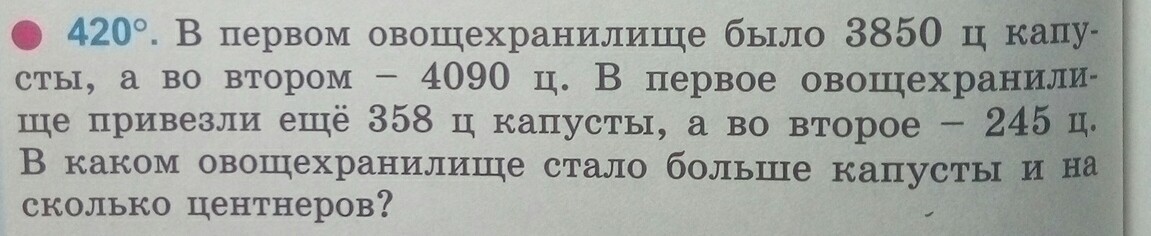 Ответ. во втором хранилище стало больше капусты на 127 центнеров.