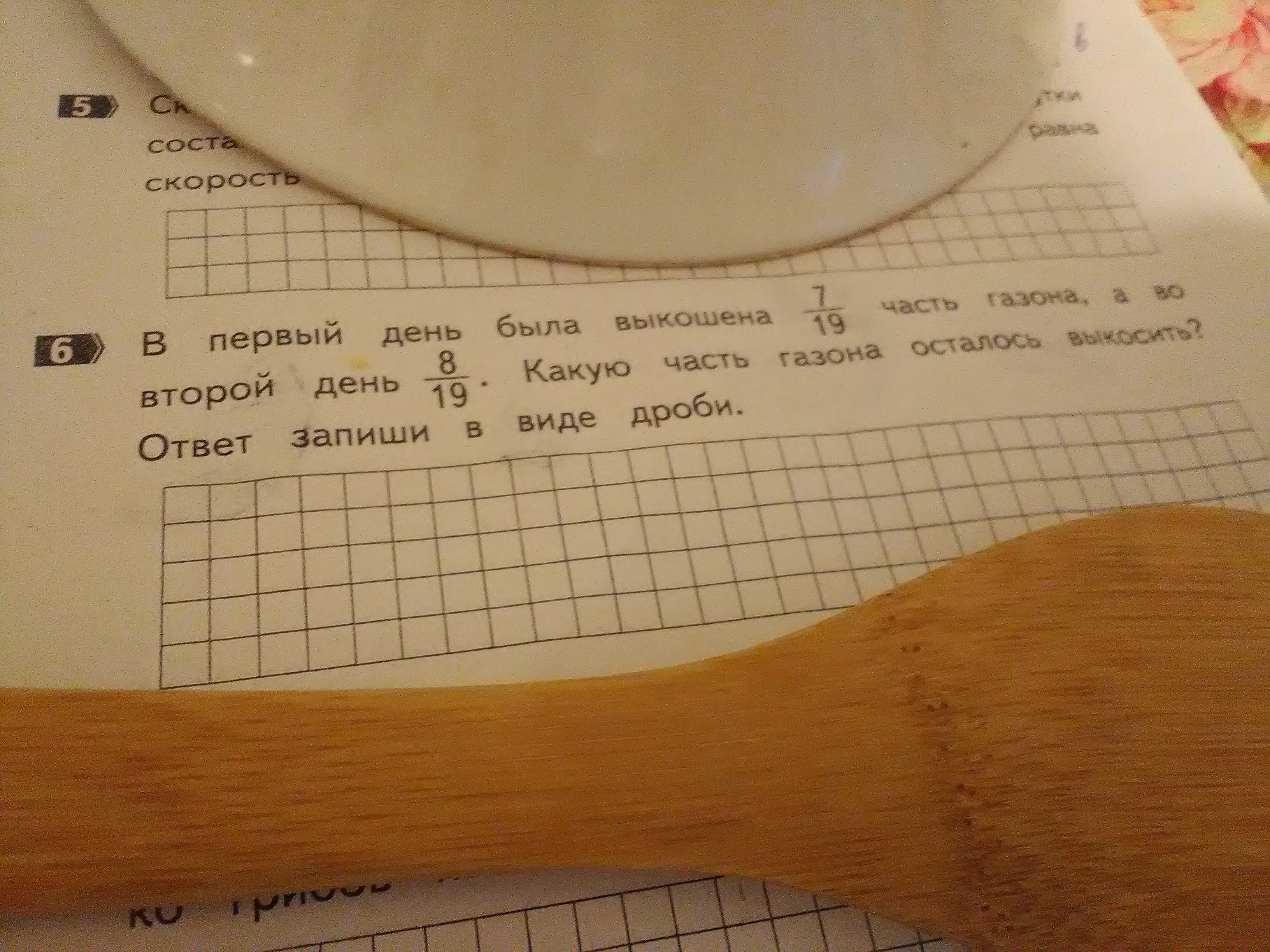 В первый день была выкошена 7/19 часть газона, а во второй день 8/19. Какую часть газона осталось выкосить?