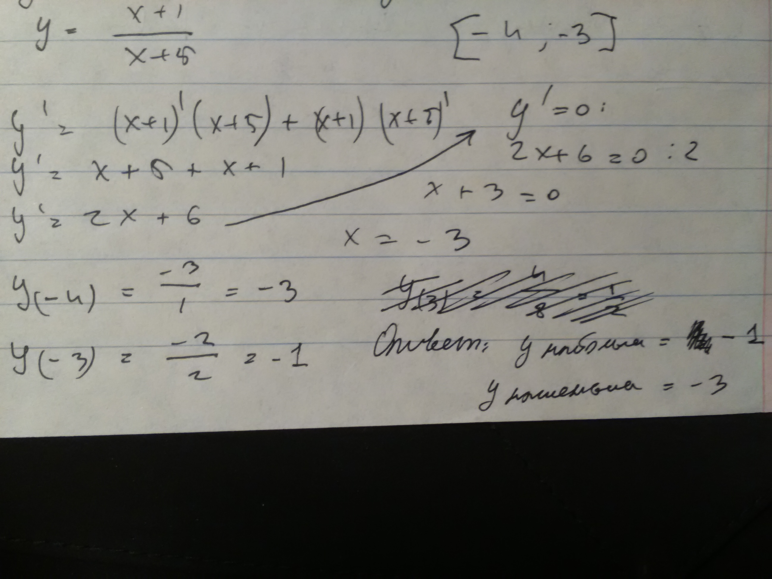 найдите наибольшее и наименьшее значение функции x+1/x+5 на промежутке -4;-3