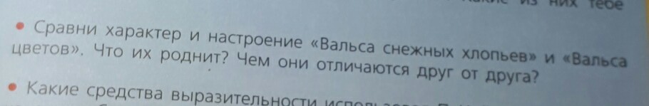 Оба вальса из балета Чайковского "Щелкунчик". Первый вальс рисует картину тревожного ночного леса. Главная тема вальса часто мелькает. Опевание нот, небольшие интервалы создают эффект кружения. В середине вальса настроение меняется. Сумрак тревожной ночи рассеивается и звучит светлое пение детских голосов. Второй вальс - это кульминация праздника. Начинаясь с таинственных переливов арфы, музыка помогает создать волнение, начинаешь ждать чуда. Так же как и в первом произведении, в "Вальсе цветов" в середине настроение меняется.Музыка здесь лиричная, певучая, светлая, безмятежная. Звук тонкий, как кружево инея на окнах. Но финал бурно праздничный. Большая роль отдана духовым инструментам. Они добавляют "Вальсу цветов" пышности, торжественности. Оба вальса обладают яркой картинностью