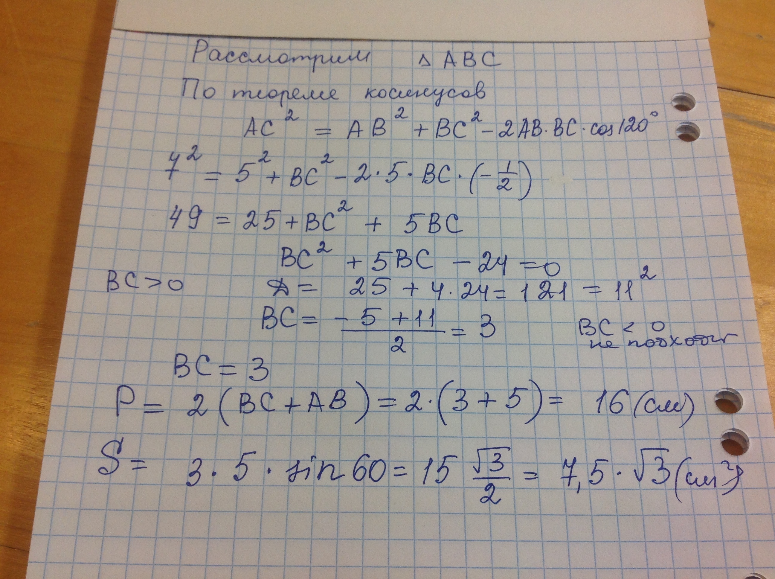 угол параллелограмма равен 120 градусов большая диагональ 7 см, а одна из сторон 5 см. Найдите периметр и площадь параллелограмма