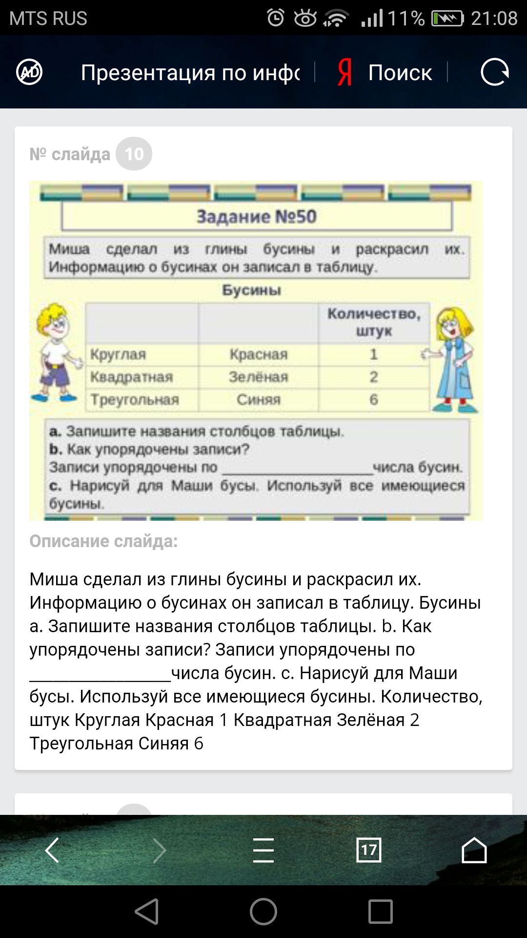миша сделал из глины бусины и раскрасил их. информацию о бусинах он записал в таблицу