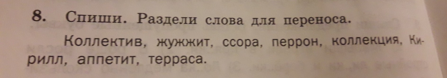 Кол-лек-тив; жуж-жит; ccо-ра; пер-рон; кол-лек-ция; Ки-рилл; ап-пе-тит; тер-ра-са. Всё! Удачи в учёбе)