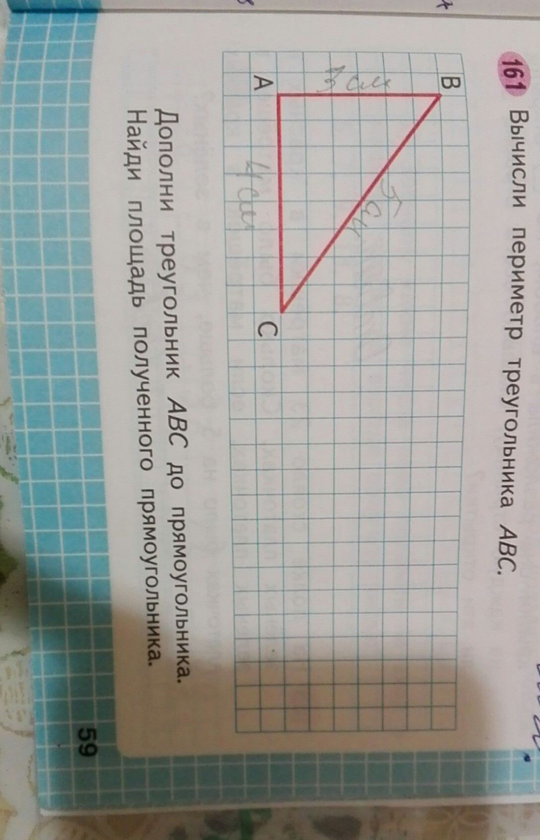 Вычисли периметр треугольника ABC. Дополни треугольник ABC до прямоугольника. Найди площадь полученного прямоугольника.