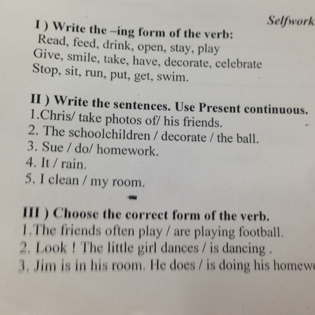 1)reading , feeding , drinking , opening , staying , playing , , giving , smiling , taking , having , decorating , celebrating, stopping , sitting , running , putting , getting , swimming