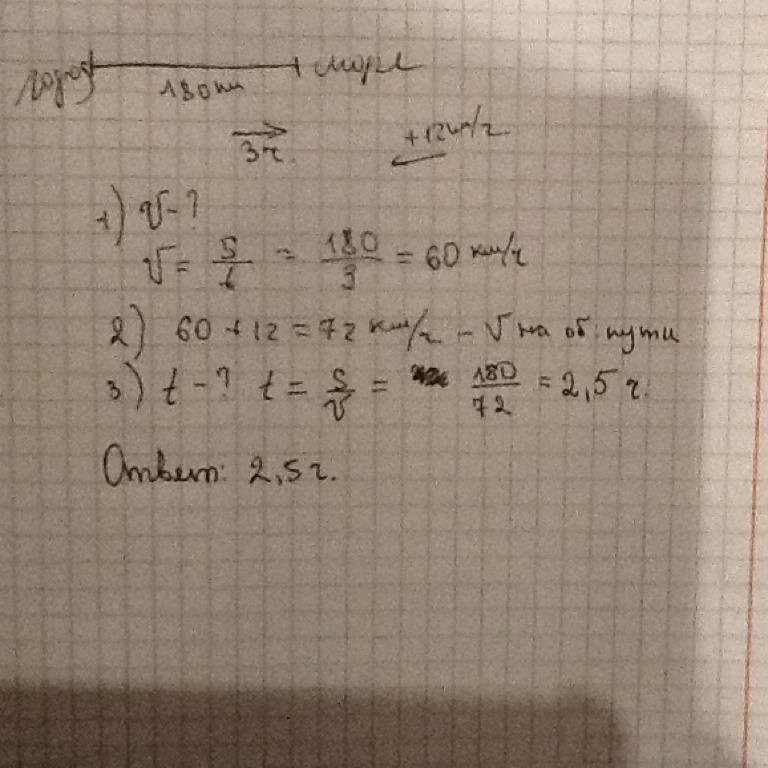 Расстояние от города до моря 180 км автобус проехал за 03:00 на обратном пути его скорость увеличилась на 12 километров в час за какое время автобус проехал домой и обратно
