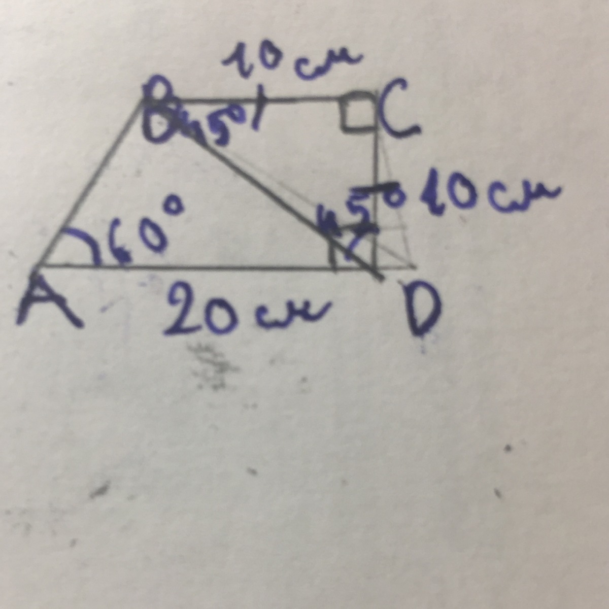 Разделим трапецию на два треугольника. Треугольник ABD и треугольник BCD. CD— основание.