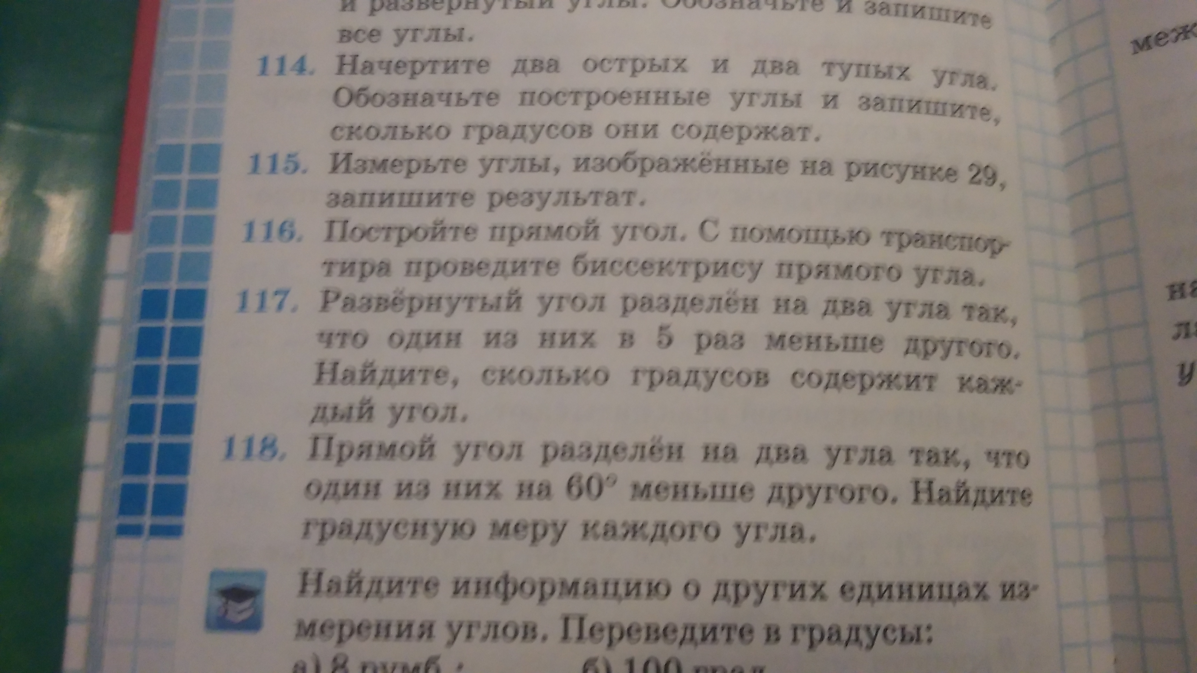 Развёрнутый угол разделён на два угла так, что один из них в 5 раз меньше другого. Найдите, сколько градусов содержит каждый угол. упражнение 117
