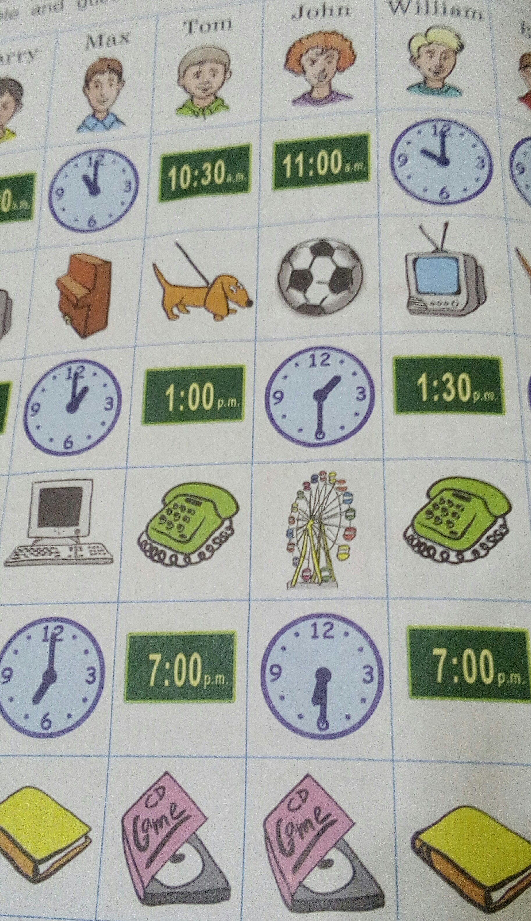 4. At 10:00 o'clock William watch TV. At 1:30 pm he make phone calls. At 7:00 pm he read a book.