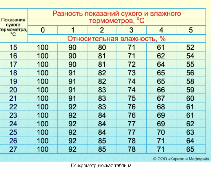 Смочите платок водой комнатной температуры и обмотайте в один слой мокрой тканью шарик термометра. Например, он покажет 19 градусов, так как испарение вызывает охлаждение. Разница составляет 2 градуса. Пользуясь таблицей можно определить влажность воздуха)