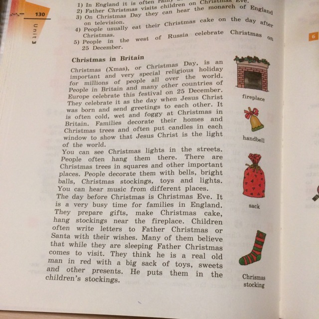 Рождество в Британии Рождество (Рождество) или Рождество, а также особый праздник для миллионов людей во всем мире. 25 декабря в этом фестивале отмечают люди в Великобритании и многих других странах Европы. Они отмечают это как день рождения Иисуса Христа и посылают друг другу приветствия. На Рождество в Великобритании часто бывает холодно, мокро и туманно. Семьи украшают свои дома и рождественские елки и часто помещают свечи в каждое окно, чтобы показать, что Иисус Христос является светом мира. улицы. Вы можете видеть рождественские огни в Люди, которые часто повесят их там. В квадратах и других важных местах есть елки. Люди украшают их колокольчиками, яркими шарами, игрушками для рождественских чулок и огнями. Вы можете слышать музыку из разных мест. Накануне Рождества накануне Рождества. Это очень напряженное время для семей в Англии. Они готовят подарки, делают рождественский пирог, наряжают чулки у камина. Дети часто пишут письма к Деду Морозу или Санта с их пожеланиями. Многие из них считают, что, пока они спят, Дед Мороз приезжает в гости. Они думают, что он настоящий старик красным, с большим мешком с игрушками, сладостями и другим подарком. Он кладет их в детские чулки.