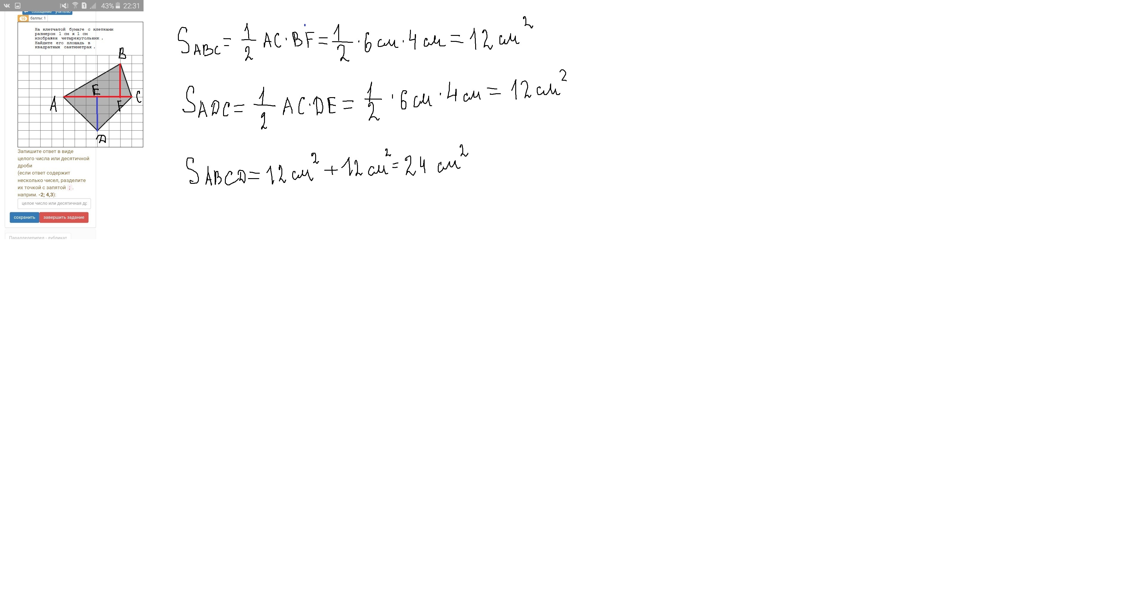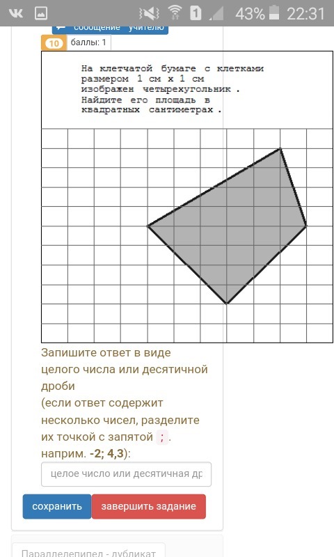 на клеточной бумаге с клетками размером 1см на 1см изображен четырехугольник Найдите его площадь в квадратных сантиметрах