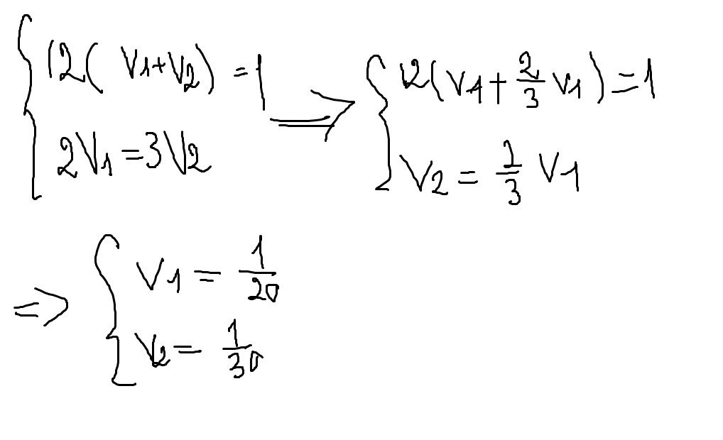 Обозначим v1 и v2 — объёмы работ, которые выполняют за день первый и второй рабочий, соответственно, полный объём работ примем за 1. Тогда по условию задачи на рисунке